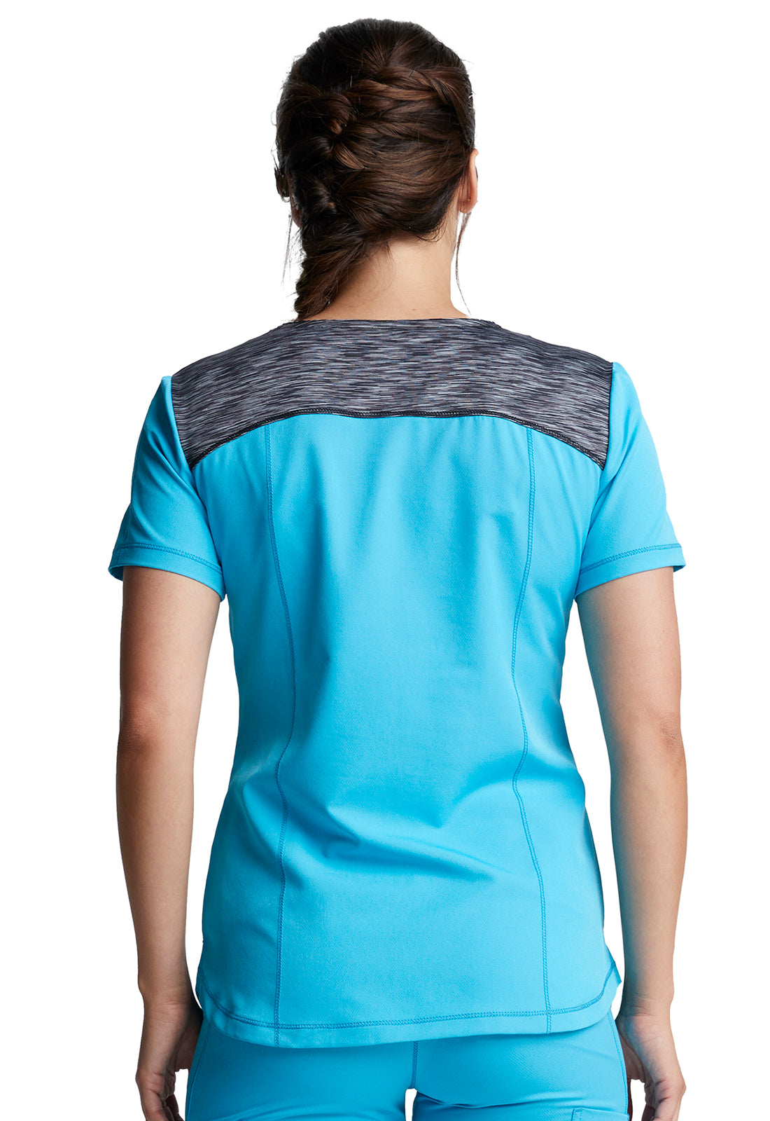 Una blusa con cuello en V de ajuste contemporáneo presenta un tejido teñido en el espacio en el cuello y los canesús delantero y trasero, detalle de línea princesa y bolsillos de parche delanteros redondeados. También se presenta un bolsillo en la manga con cierre de cremallera con logotipo tonal transferido por calor, dobladillo de cola de camisa, aberturas laterales y detalles de pespuntes en todas partes.